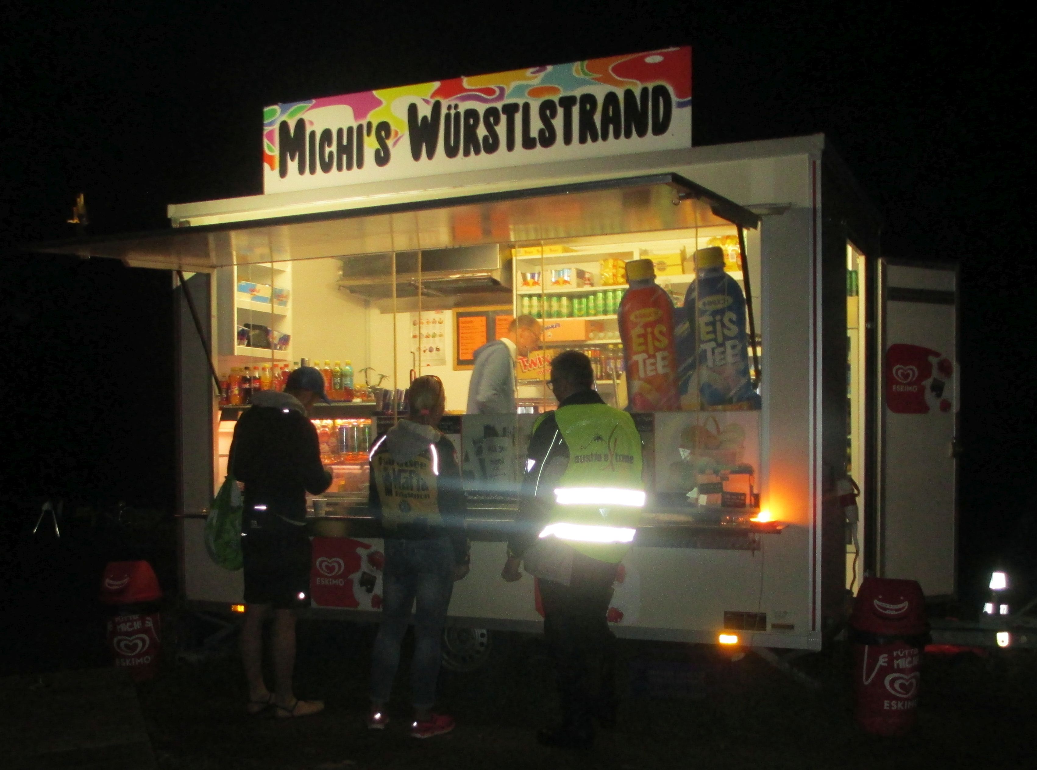 Beim schweren Anstieg zur Südwandhütte, dem höchsten Punkt der Strecke anderthalb Kilometer vor dem Ziel wurde es langsam dunkel und der Nieselregen ging in Regen über. Blinklichter wiesen uns den Weg, eine fast romantische Stimmung. Einen Kilometer ging es noch extrem steil rauf und ich will nicht wissen, wie ich dort ohne Anschieben durch Manuel raufgekommen wäre. An der Hütte wieder sehr liebe Streckenhelfer, es wurde ein Foto von uns gemacht und nach einer Tasse Tee freuten wir uns auf die letzten 1500 Meter zum Ziel. Das liegt an der Talstation der Dachsteinseilbahn und war jetzt in der Dunkelheit an den Lichtern gut erkennbar.