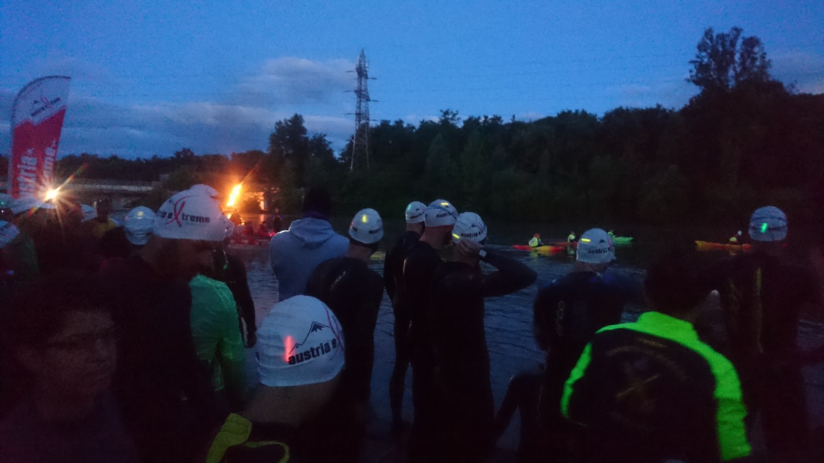 Der Start zum Schwimmen erfolgte um 4 Uhr 30. Geschwommen wurde erst mit, dann auf dem Rückweg gegen die Strömung. Zur Strömung hieß es bei der Wettkampfbesprechung: aufwärts schwimmen sei „machbar“. Was heißt denn machbar? Darüber konnte man beim Einschlafen noch Grübeln. Im Rückblick war das Schwimmen aber die leichteste Übung. Mit Neoprenkappe und Neosocken ausgerüstet war es im Wasser schon fast gemütlich. Nachdem die ersten Meter aufwärts geschafft und die erste Boje umrundet waren, ging es in flottem Tempo stromab bis zu den beiden Wendebojen. Der Rückweg zog sich hin, aber nah am Ufer kam man tatsächlich gut vorwärts.