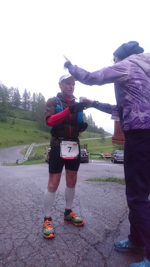 Es starten etwa hundert Athleten und jeder brachte noch (mindestens) einen Supporter mit. Der musste die letzten 17 km und 1000 HM mitlaufen. Abgesehen davon musste der Athlet auf der gesamten Strecke verpflegt, mit Wechsel- oder Regenkleidung versorgt und ihm möglichst jeder Wunsch von den Augen abgelesen werden. Meine Supporter waren Manuel Hohenleitner (auch MRRC) und meine Frau Jutta. Manuel war als Supporter und Begleitläufer ein wahrer Glücksgriff. Er ist nicht nur ein austrainierter Bergläufer (13. Platz auf dem 81 km langen Zugspitz Supertaril XL eine Woche zuvor) sondern auch aufmerksamer und tatkräftiger Unterstützer. Manuel und Jutta hatten an jedem Treffpunkt alles zur Hand, was ich gerade benötige.