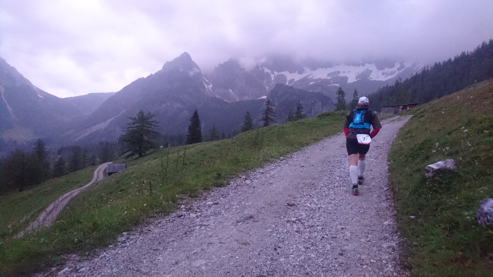 In der zweiten Wechselzone zog ich mich wieder komplett um. Die letzten 50 km hatte ich wegen der Kälte eine Regenjacke an und war nach dem Anstieg zur Sölksperre klatschnass. Gemäß Höhenprofil geht es auf der Laufstrecke erst einmal 10 km runter, aber auch hier warten giftige Anstiege mit bis zu 25% Steigung. Da brannten beim Gehen schon die Oberschenkel. Wie sollte das erst gegen Ende des Laufs am Anstieg zur Südwandhütte werden? Nur zu Beginn führt die Laufstrecke über kleinere Teilstücke Straße, ansonsten aber über Forstwege und Trails. Das ist abwechslungsreich und lenkt von der Erschöpfung ab.