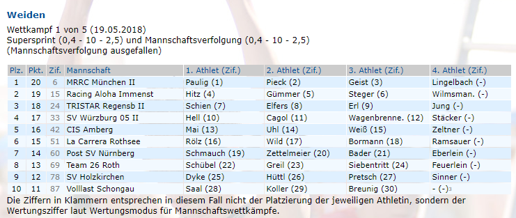Mit dem Start am morgen beim Einzel-Super-Sprint sicherten sich die Mädels den Platz 1 mit 40sec Vorsprung auf den zweiten Platz. Wegen Gewitter fiel der Team-Super-Sprint am Nachmittag leider ins Wasser. Somit bleibt Platz 1 das Endergebnis für die Mädels beim ersten Wettkampf in Weiden.