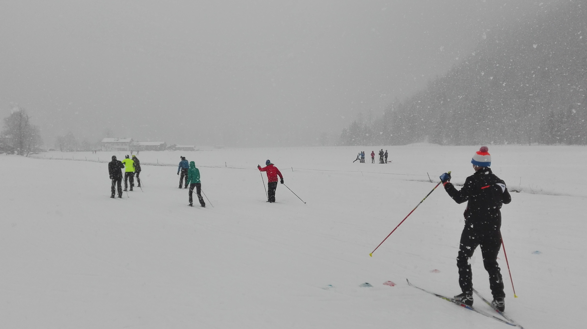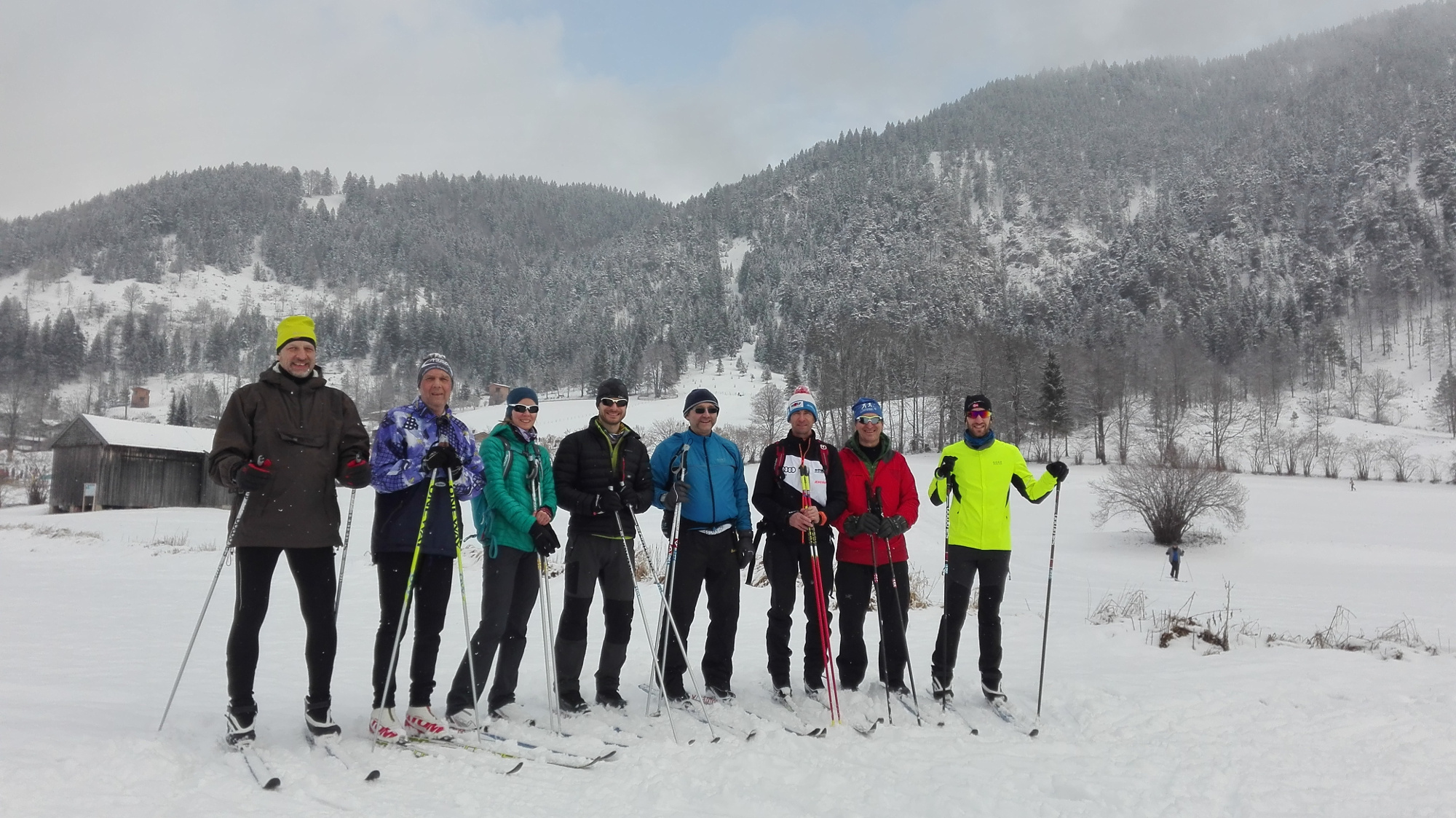 Nachdem der Kurs im Januar krankheitsbedingt abgesagt wurde, durften am 4. Februar auch wir Anfänger auf die Langlaufpiste in Bayrischzell. So dachten wir zumindest. Doch wie bei jedem anderen Training auch, gab's erst ein kurzes Aufwärmprogramm, und Jürgen, unser Trainer, bewegte sich beneidenswert fit im Schneefeld.