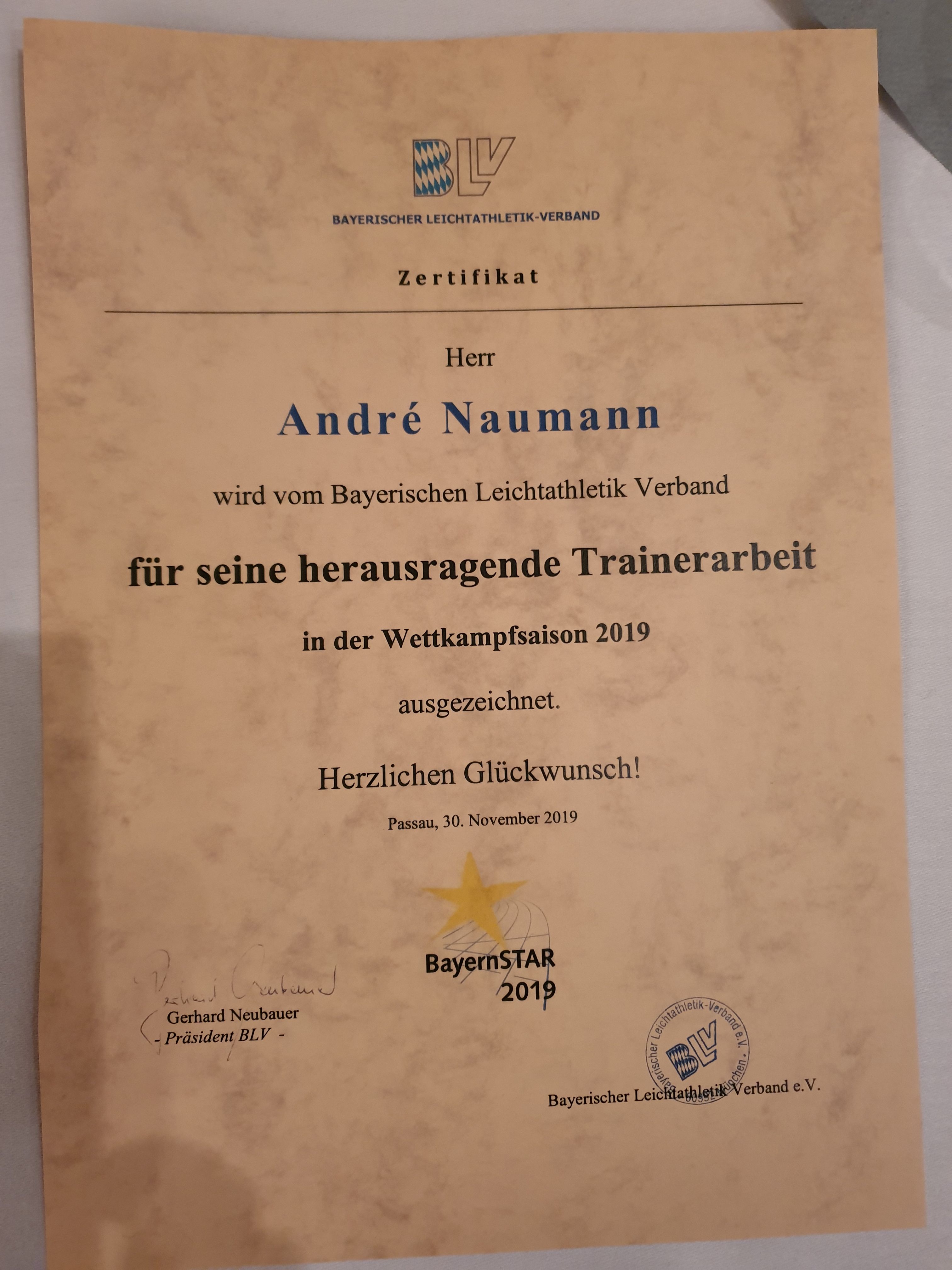 Ebenfalls mit dem BayernStar 2019 wurde unser Trainer der MRRC-Leistungsgruppe André Naumann für herausragende Trainerarbeit bedacht.