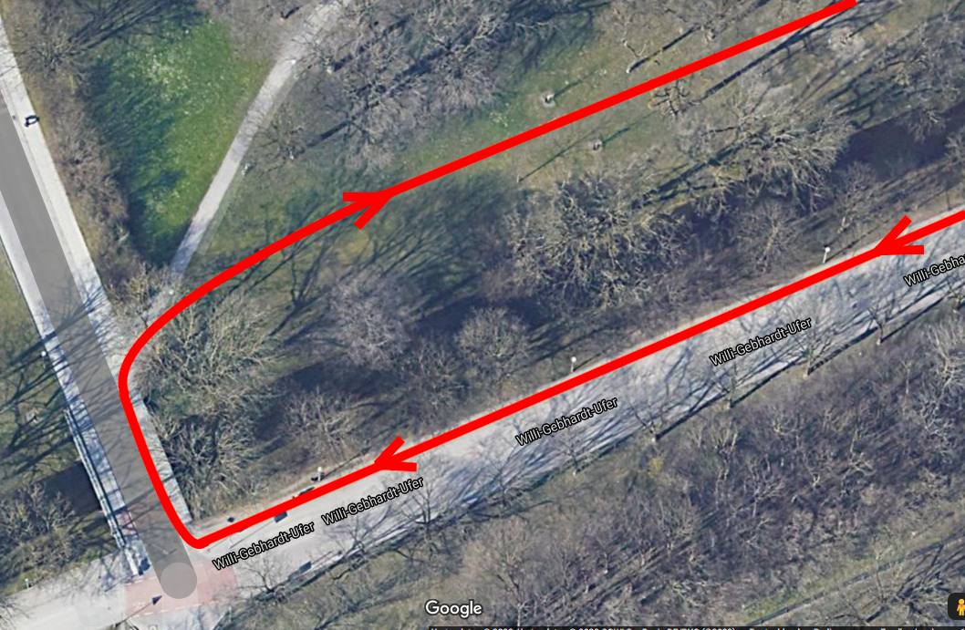- Die Baustelle wird östlich statt westlich umrundet (NEU: Aufgrund der dynamischen Baustellensituation ist leider der schmale Weg hinter dem Radstation nicht mehr laufbar. Die Ausweichroute könnte so aussehen, wie dunkelblau gekennzeichnet.)